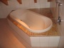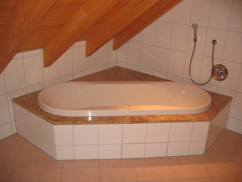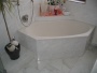 Badewanne mit erhöhter Eckablage und Marmorboden. |