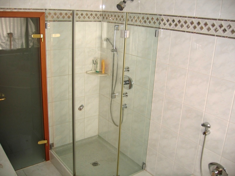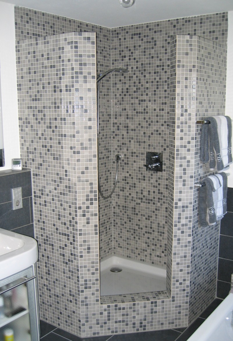 Mosaikdusche mit Übereckeinstieg. |