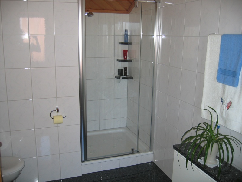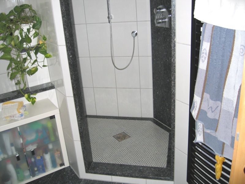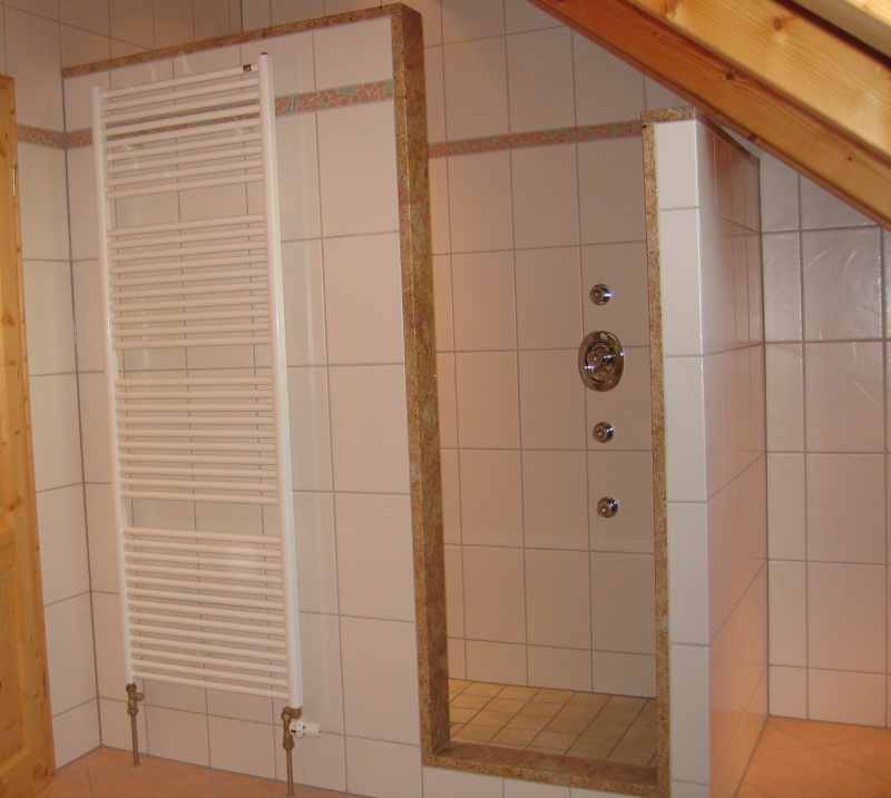 Großzügig gemauerter Duschbereich, Materialmix aus