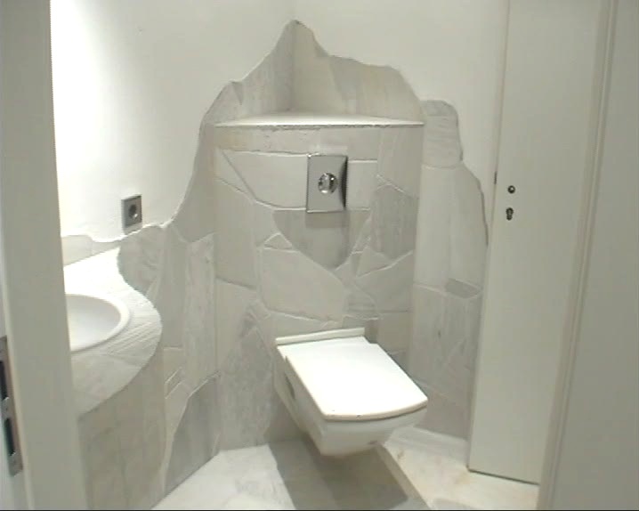 Sanitärbereich mit Polygonalverlegung an Wand und